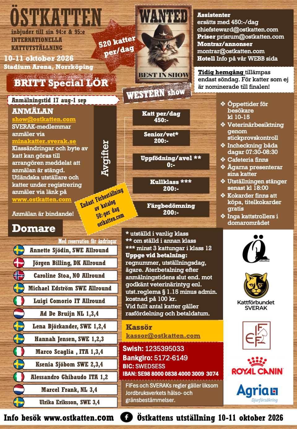 Betala in anmälningsavgiften Swish: 1235395033 Bankgiro: 5172-6149 På betalningen ska det stå REG-NR för varje utställd katt, dag, samt ägarens namn och telefonnummer