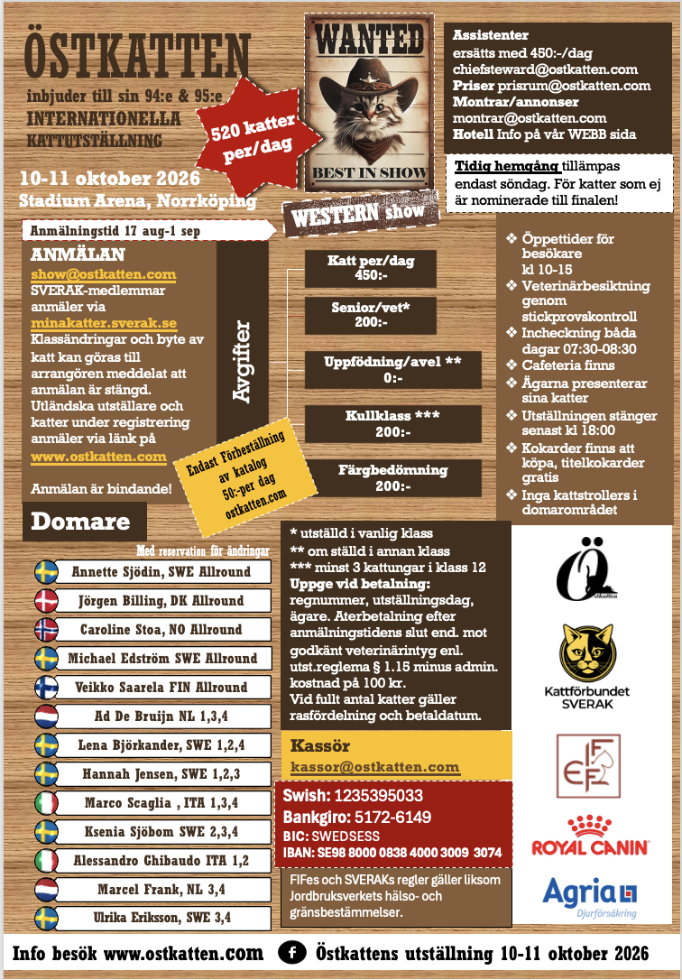 För alla frågor gällande klassändringar, byte av katt, fel i anmälan vänligen kontakta Hanna & Åsa via email